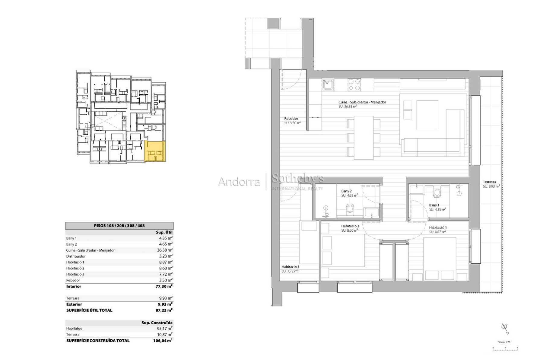 Discover this magnificent new work located in El Tarter. With an area of 106.03m2, this property offers a modern and spacious space to enjoy it to the fullest. The kitchen, integrated into the living room, creates a cozy and functional atmosphere. From here you can access a lovely 10.86m2 terrace with views. With two spacious double bedrooms, including a stunning suite, a single bedroom, and two full bathrooms, this home is perfect for those looking for comfort and style. The building has a private garage for two cars, which provides additional comfort and allows you to have your vehicles protected from the cold and snow. This property is fitted with high quality features including energy efficient LED lighting, underfloor heating and an elegant electric fireplace. In addition, it has home automation that allows you to easily control and manage home systems from your smartphone. Top-quality appliances offer you an exceptional culinary experience, while radiant floors and porcelain stoneware add a touch of warmth, sophistication and durability. The community has a spa and a community relaxation area, where you can enjoy swimming pools and jacuzzis, creating an atmosphere of well-being and relaxation. In addition, a central courtyard with a green area completes this environment, providing a quiet and natural space. Don't miss the opportunity to live in this wonderful property in El Tarter.Features