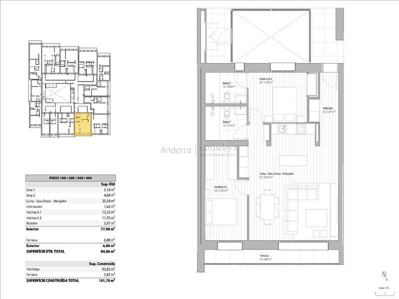 Discover this magnificent new work located in El Tarter. With an area of 101.81m2, this property offers a modern and spacious space to enjoy to the fullest. The kitchen, integrated into the living room, creates a cozy and functional atmosphere. From here you can access a charming terrace of 7.87 m2 with views. With two spacious double bedrooms, including a stunning suite, and two full bathrooms, this home is perfect for those looking for comfort and style. The building has a private garage for two cars, which provides additional comfort and allows you to have your vehicles protected from the cold and snow. This property is fitted with high quality features including energy efficient LED lighting, underfloor heating and an elegant electric fireplace. In addition, it has home automation that allows you to easily control and manage home systems from your smartphone. Top-quality appliances offer you an exceptional culinary experience, while radiant floors and porcelain stoneware add a touch of warmth, sophistication and durability. The community has a spa and a community relaxation area, where you can enjoy swimming pools and jacuzzis, creating an atmosphere of well-being and relaxation. In addition, a central courtyard with a green area completes this environment, providing a quiet and natural space. Don't miss the opportunity to live in this wonderful property in El Tarter.Features