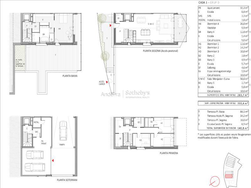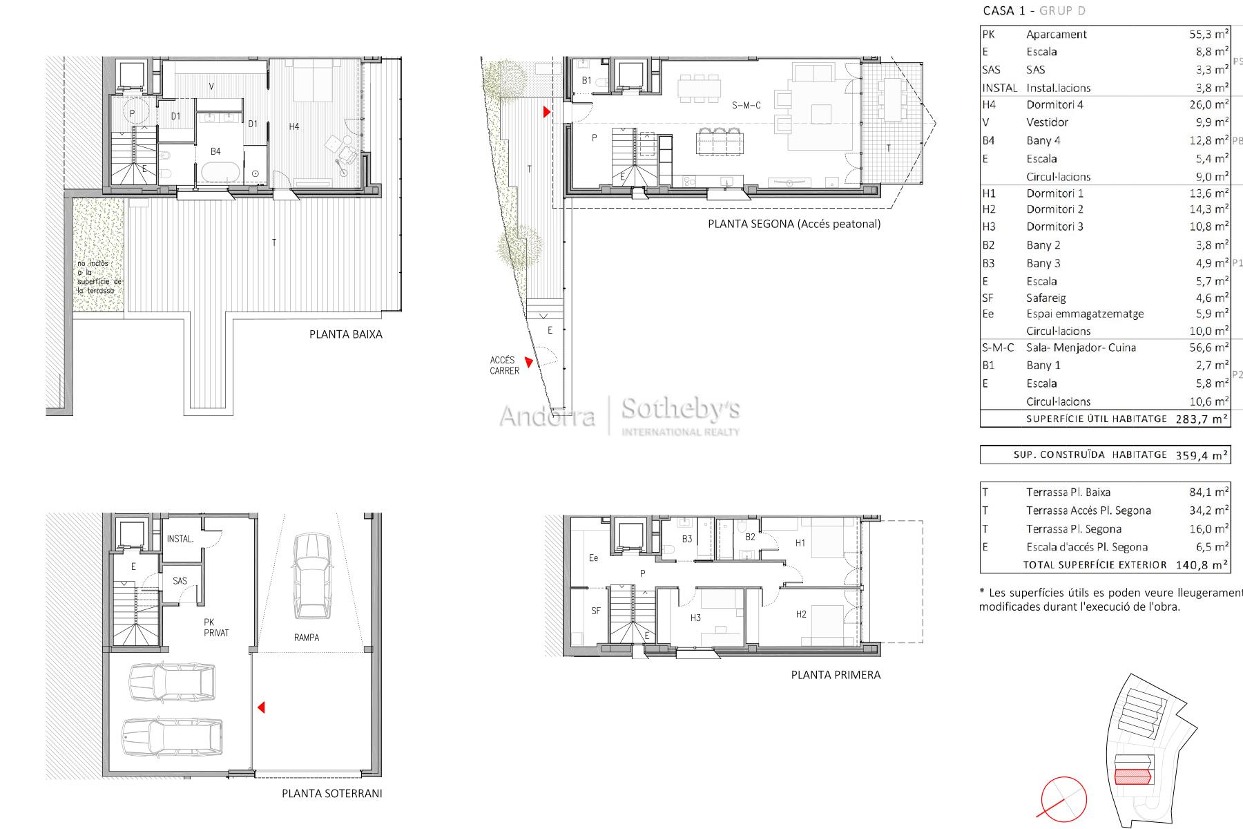 Exclusiva casa de nueva construcción ubicada en La Pleta del Solà del Tarter, una de las zonas residenciales más demandadas por su proximidad a las pistas de esquí de Grandvalira y su entorno natural privilegiado. La vivienda cuenta con una superficie construida de 359,4 m², de los cuales 283,7 m² son útiles habitables, y una amplia superficie exterior de 140,8 m² distribuida en varias terrazas: una de 84,1 m², otra de 34,2 m², una de 16 m² y una escalera exterior de. La casa dispone de cuatro habitaciones y cuatro baños, ofreciendo espacios amplios, luminosos y pensados para el confort. La zona de día incluye un espacio de salón-comedor con cocina abierta, ideal para crear un ambiente integrado y funcional. También cuenta con zona de lavadero independiente y un garaje cerrado de 55 m², con capacidad para varios vehículos. La vivienda ofrece acabados de calidad y una arquitectura moderna pensada para integrarse con el entorno y aprovechar al máximo la luz natural y las vistas. *Las superficies útiles se pueden ver ligeramente modificadas durante la ejecución de la obra.Características