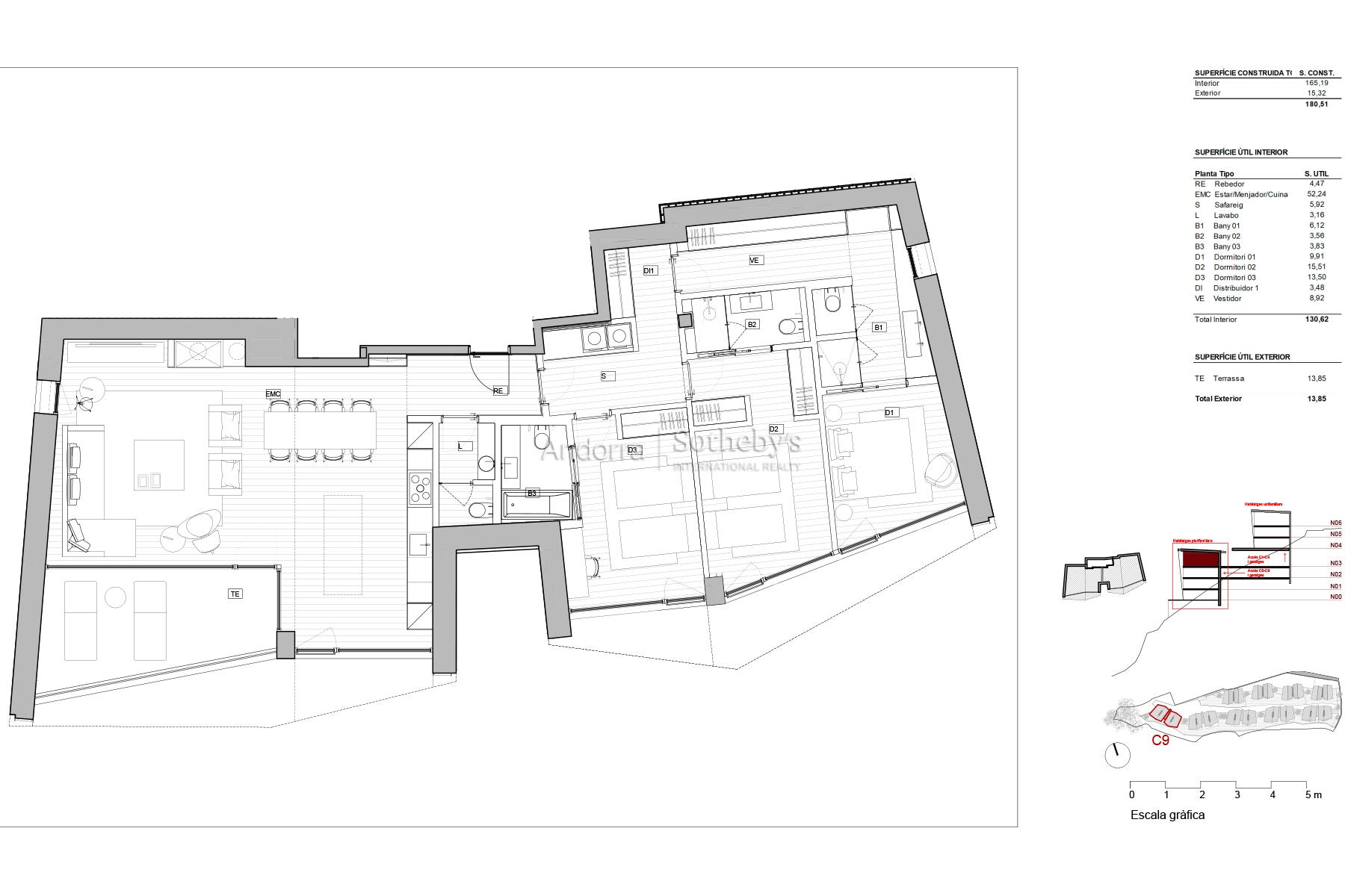 VIVIENDA 9.4 Bienvenido a su nuevo hogar en Els Vilars, Escaldes, donde la elegancia y la naturaleza se fusionan en perfecta armonía. Este exclusivo apartamento de obra nueva redefine el concepto de vida contemporánea, ofreciendo un espacio acogedor rodeado de un entorno natural privilegiado. Ubicado a solo unos minutos del vibrante centro de Andorra la Vella, disfrute de un acceso inmediato a una amplia gama de servicios, tiendas y opciones de ocio. Ideal para aquellos que buscan una vida activa y plena, sin renunciar al confort y la tranquilidad. Diseñada con un enfoque sostenible, esta propiedad es una joya arquitectónica que destaca por su estructura con amplios ventanales, que iluminan cada rincón con luz natural, creando una atmósfera de serenidad y pureza. Las impresionantes vistas que ofrece hacia Escaldes y las majestuosas montañas de los alrededores, junto con su orientación sur, proporcionan una iluminación excepcional a lo largo del día, desde el amanecer hasta el atardecer. El apartamento dispone de tres dormitorios en suite, un baño de invitados, un práctico lavadero y terrazas que ofrecen vistas privilegiadas. Su distribución inteligente incluye un amplio espacio de comedor con acceso a la terraza, así como una cocina equipada con una emblemática chimenea que integra los diferentes espacios con elegancia. Orientado principalmente hacia el sureste, el apartamento es un modelo de eficiencia energética, complementado con jardines y zonas verdes que proporcionan un espacio íntimo y relajante. Descubra la verdadera esencia de la vida andorrana en esta villa única, donde cada detalle ha sido cuidadosamente atendido para asegurarle el máximo confort y una existencia llena de armonía y belleza. Haga de su sueño una realidad e infórmese sobre esta excepcional propiedad inmobiliaria hoy mismo.Características